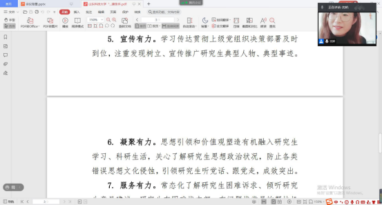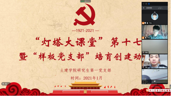 为进一步规范党支部的组织生活,提高支部党员的理论学习水平,深入推进“研究生样板党支部”的培育创建工作,确保党员队伍放假“不掉线”。1月28日下午,正规滚球app平台官网研究生第一党支部通过腾讯会议线上召开支部大会,集中组织学习了“灯塔大课堂”第十七讲,并就“研究生样板党支部”的创建工作作了动员,研究生第一党支部全体党员、学工办老师沈娇及部分入党积极分子代表参与了本次会议,会议由党支部书记韩一鸣主持。