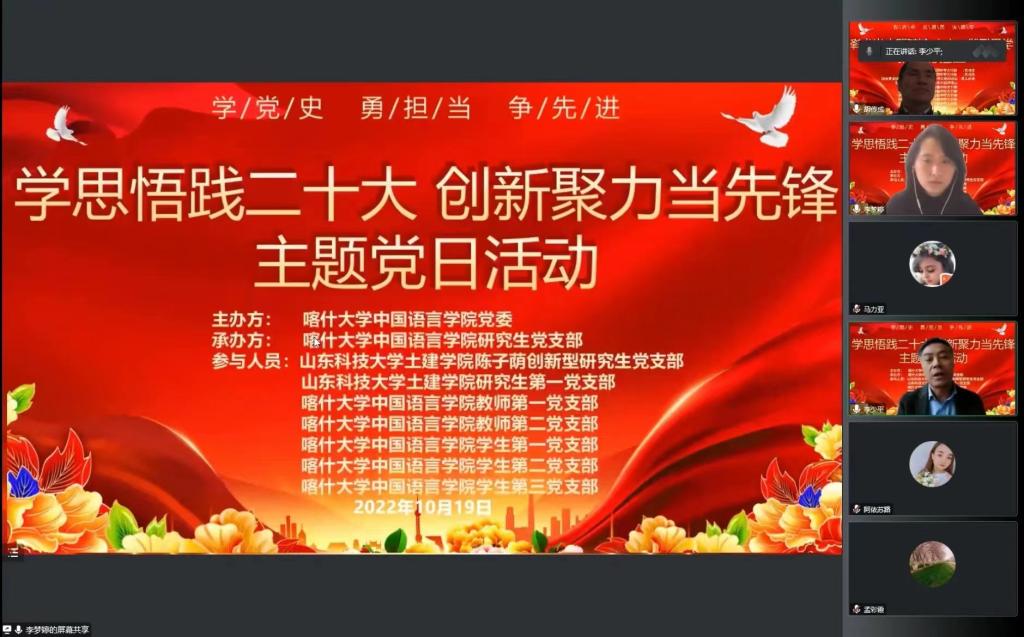 为庆祝党的二十大胜利召开,激发广大师生党员学习党的二十大精神,10月19日,正规滚球app平台官网研究生党支部与喀什大学中国语言学院党支部线上开展“学思悟践党的二十大 创新聚力当先锋”主题党日活动。喀什大学中国语言学院党委书记李少平、喀什大学中国语言学院教师党支部、学生党支部,学院陈子荫创新型研究生党支部、研究生第一党支部参加了此次会议。会议由喀什大学中国语言学院研究生党支部组织委员李梦婷主持。