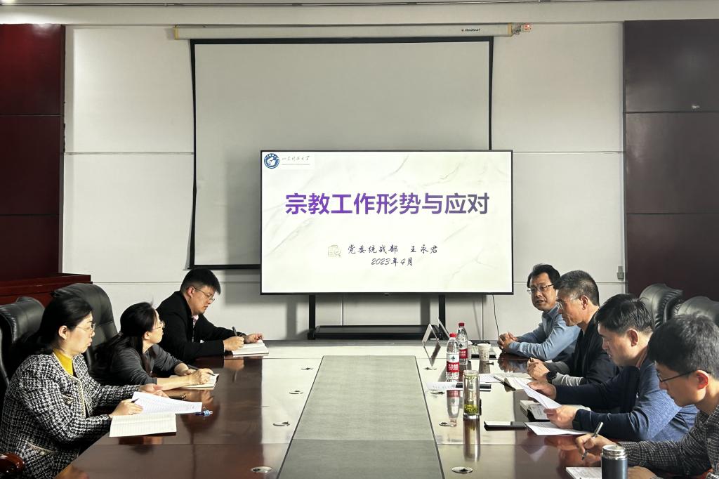 4月18日,正规滚球app平台官网党委理论学习中心组(扩大)开展2023年第六次集体学习,学校党委统战部常务副部长、台港澳工作办公室主任王永君应邀作《宗教工作形势与应对》专题报告。会议由学院党委书记宋西路主持。学院党委理论学习中心组、全体党支部书记、教工党支部支委委员、系所中心主任、科室负责人参加了会议。