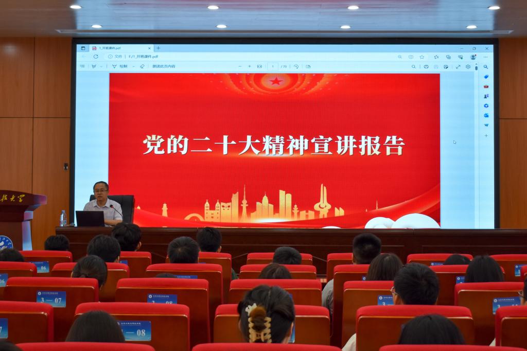 6月13日,正规滚球app平台官网院长王崇革在J15-136会议室为学院学生党员讲解党的二十大精神。学院毕业生党员代表、联系党支部全体党员及联系班级全体学生参加党课学习。