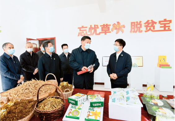 2020年5月11日至12日,中共中央总书记、国家主席、中央军委主席习近平在山西考察。这是5月11日下午,习近平在大同市云州区西坪镇坊城新村技能培训服务站,察看黄花产业相关产品展示。 新华社记者 谢环驰/摄
