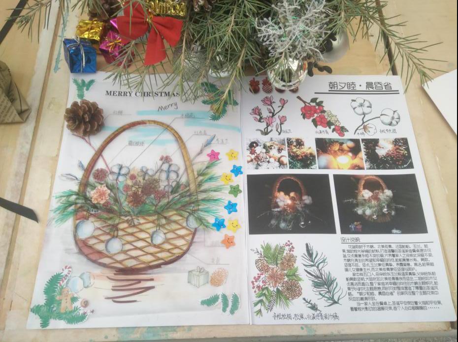 课后,建筑学与城乡规划16级的学生们分别针对自己的主题进行了花材选取与插画制作,并手绘设计稿。学生们表示自己的花艺初体验收获颇丰,不仅学习到了插花的技能,还收获了不少人生感悟。建筑学的王东宇同学打造的主题圣诞温情家庭花篮,以花喻人,对应不同的家庭成员性格适配花材,“朝夕和睦,晨昏自省”的家风和主题跃然纸上。城乡规划的刘子涵同学以玫瑰、勿忘我为主体花材,借以表现朝气蓬勃的青春少年的懵懂、纯粹与热烈的感情。