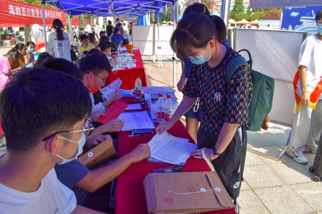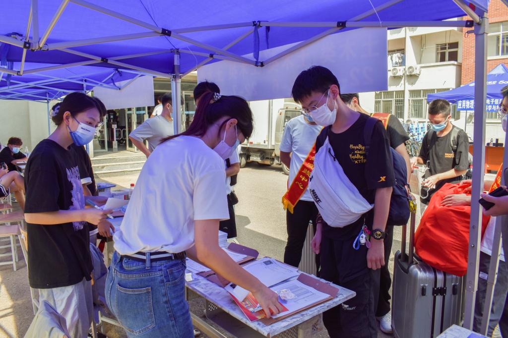 亮码、测温、出示相关证件,新生随后搭乘摆渡车去往报道点。热情的学长学姐等不及摆渡车停稳就招呼着,询问专业和班级、帮忙搬行李、带领前往迎新岗,审核完证件就可以领钥匙进宿舍啦!正规滚球app平台官网出动百余名志愿者服务于南门、北门、尤洛卡广场以及宿舍楼等多个站点,为新生及时提供咨询问路、行李搬运等贴心服务。