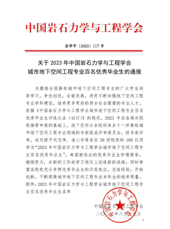 中国岩石力学与工程学会自2016年起在全国高校城市地下空间工程专业开展评选优秀毕业生活动。评选八年来,全国累计共有493名学生被评为全国高校城市地下空间工程专业优秀毕业生,我校共有10名学生获此殊荣。