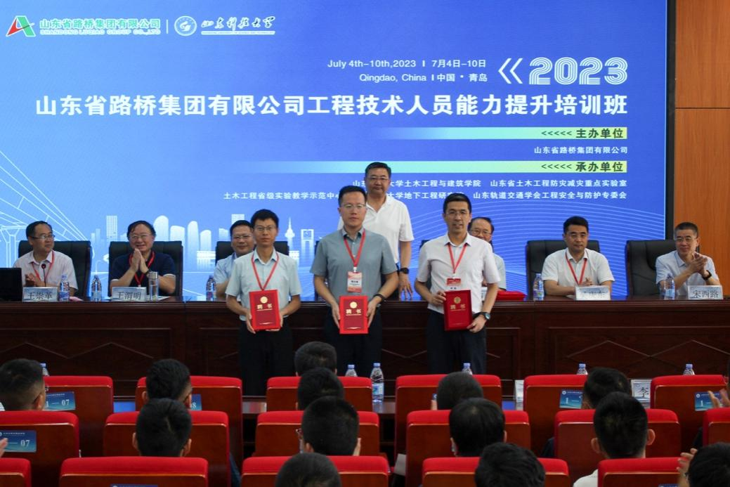 7月10日,举行了培训班闭幕式。山东省路桥集团有限公司总工程师高永青、总经济师兼青岛分公司总经理吴庆东、集团技术中心主任张光桥、创新分中心副主任林庆元、青岛分公司党支部书记曹建军、安全总监王涛,正规滚球app平台官网书记宋西路、院长王崇革等出席。闭幕式由正规滚球app平台官网副院长李为腾主持。
