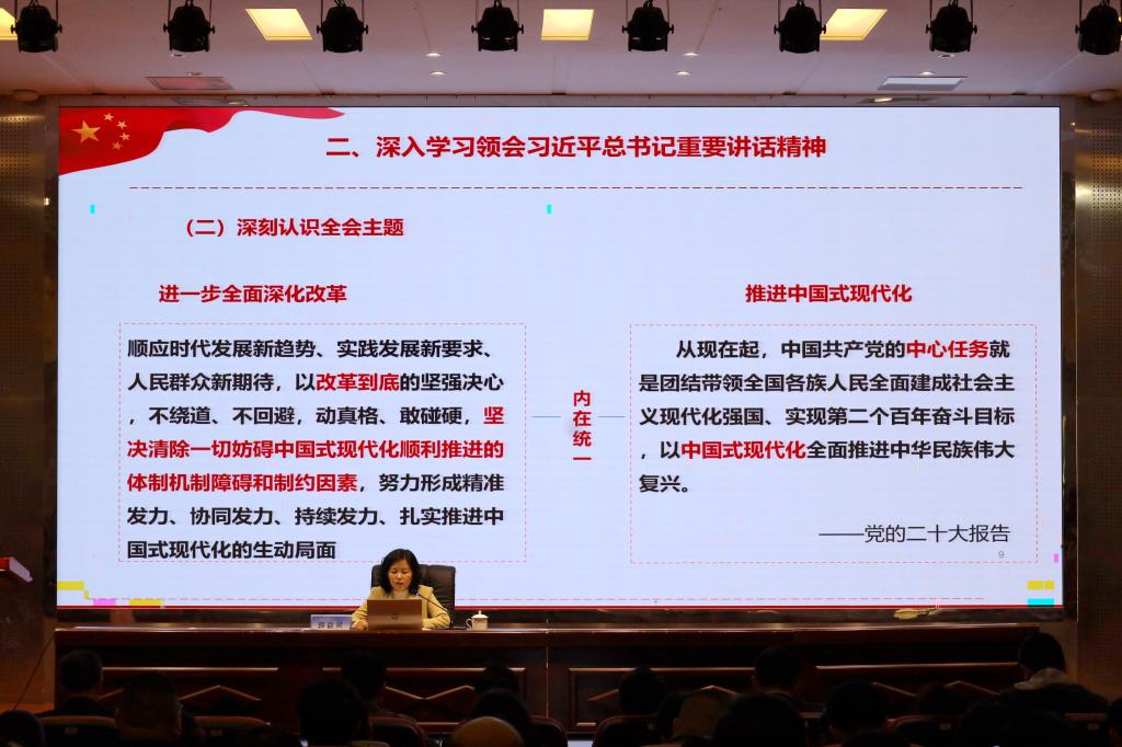 郭益灵从“党的二十届三中全会基本情况”“深入学习领会习近平总书记重要讲话精神”“全面准确理解进一步全面深化改革重大举措”“全力以赴抓好全会精神贯彻落实”四个方面,通过案例引用、数据分析和政策解读等深入阐释了党的二十届三中全会精神,让参会师生对全会作出的重大战略部署特别是“统筹推进教育科技人才体制机制一体改革”有了更加准确和深刻的理解。