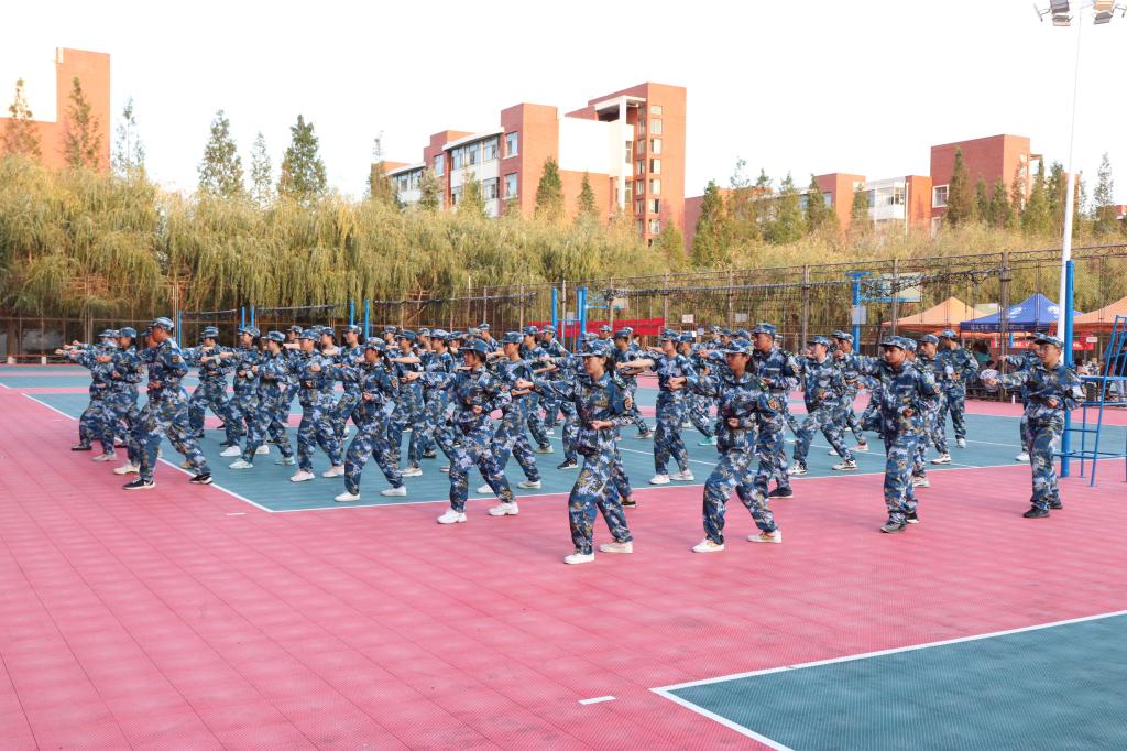 上午,新生们依旧重复进行着军姿站立、齐步走、蹲下与起立等训练。重复简单的训练不仅是对之前学过项目的复习,更是对他们意志的考验,虽然训练项目简单,但认真的态度和坚定的眼神不曾改变。下午,新生开始进行军体拳和方队踢正步训练。“一二一,一二一……”响亮的口号声在训练场地的上空徘徊,而这迷彩的身姿也在排球场熠熠发光。一次次走方队、一次次打军拳、一次又一次地踢正步,这些日复一日的训练在他们眼中,似乎并不是那么的枯燥无味,他们的眼中有坚毅、有热血、有目标、有方向。随着时间的流逝,新生们的军姿、正步和踏步的每一个步骤都力求做到完美。在休憩间隙,教官们组织新生们进行拉歌比赛,那响亮的歌声无不呈现出当下青年的蓬勃与朝气。