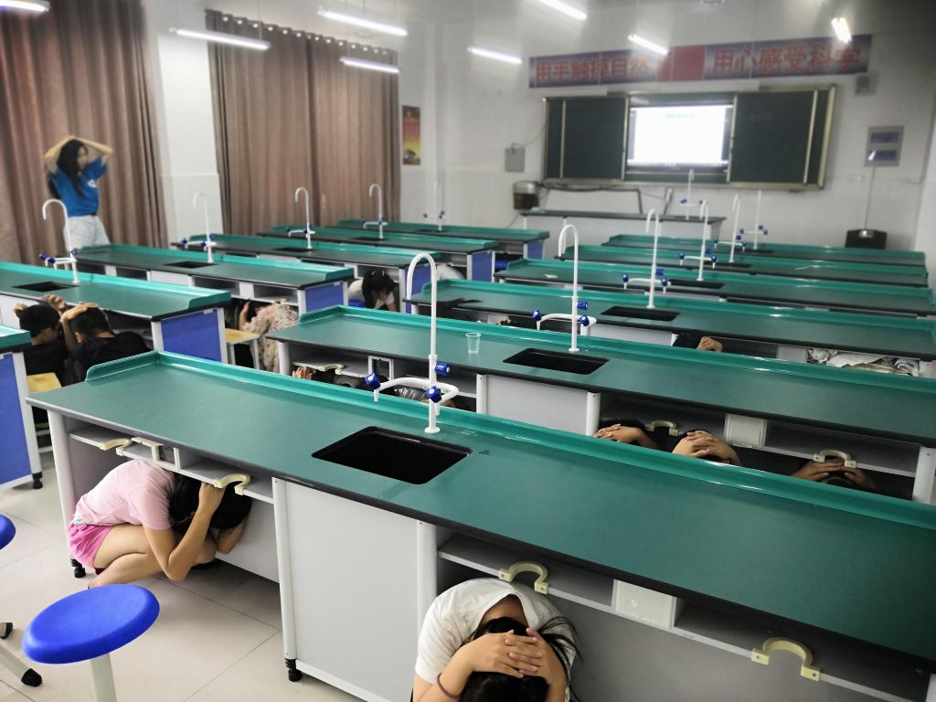 上午11点,伴随着急促刺耳的警报声,地震演练正式开始。讲师团队员迅速组织学生们采取自救措施,他们用胳膊护住头部,有的钻到桌子下,有的蹲在墙角边,当第二次报警声响起时,随着“用手抱头,弯腰低姿,有序撤离”的口令,负责各班的宣讲队员迅速组织本班的学生按照规定逃生路线向外撤离疏散,在指定的安全区域站队,清点人数,汇报情况,整个演习井井有条。最后,讲师团队长朱家璇对本次演练进行了总结,指出了演练中存在的一些问题,同时还对同学们详细解说了除地震外,发生火灾的逃生方法,并对暑期可能会发生的安全隐患进行了讲解。