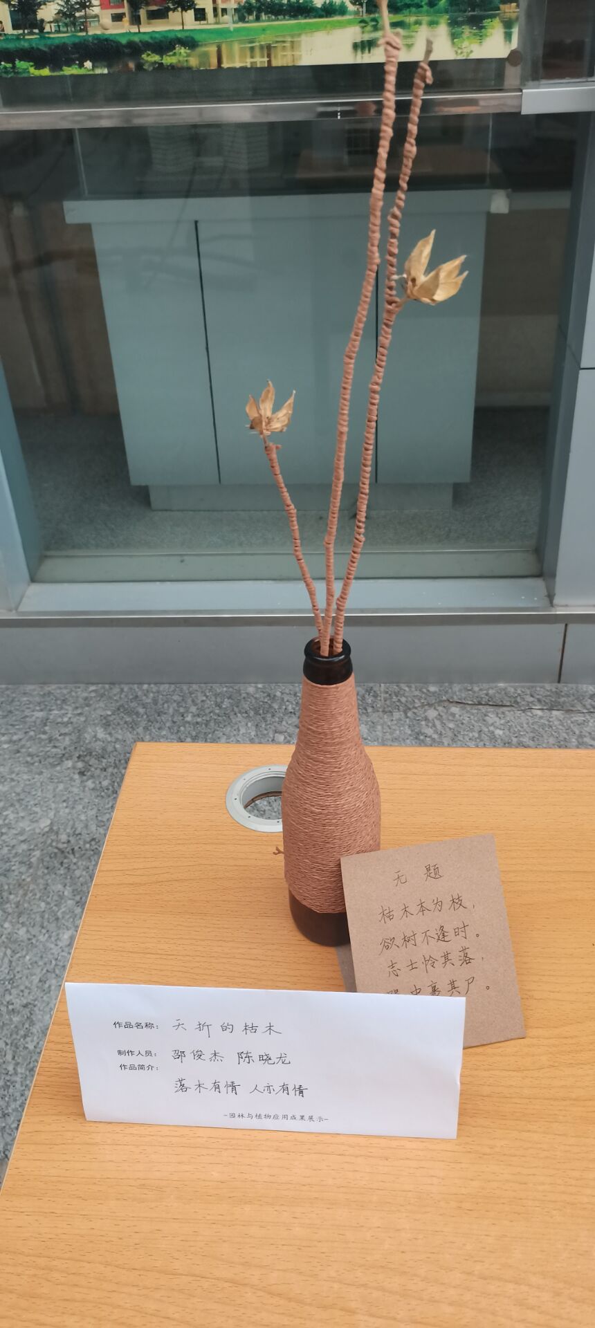 该展览旨在提高同学们的创新意识,激发同学们学习的积极性,提升专业素养,培养发现美、展现美的能力。展览过程中,同学们将原本“丑”“杂乱无章”的枯木经过一番加工,变成了精美的“花瓶”“梅花鹿”……作品设计手法清新自然,植物配置精心制作,体现了枯木中富有生机的自然美感,展现出了一幅幅别具一格的画面。