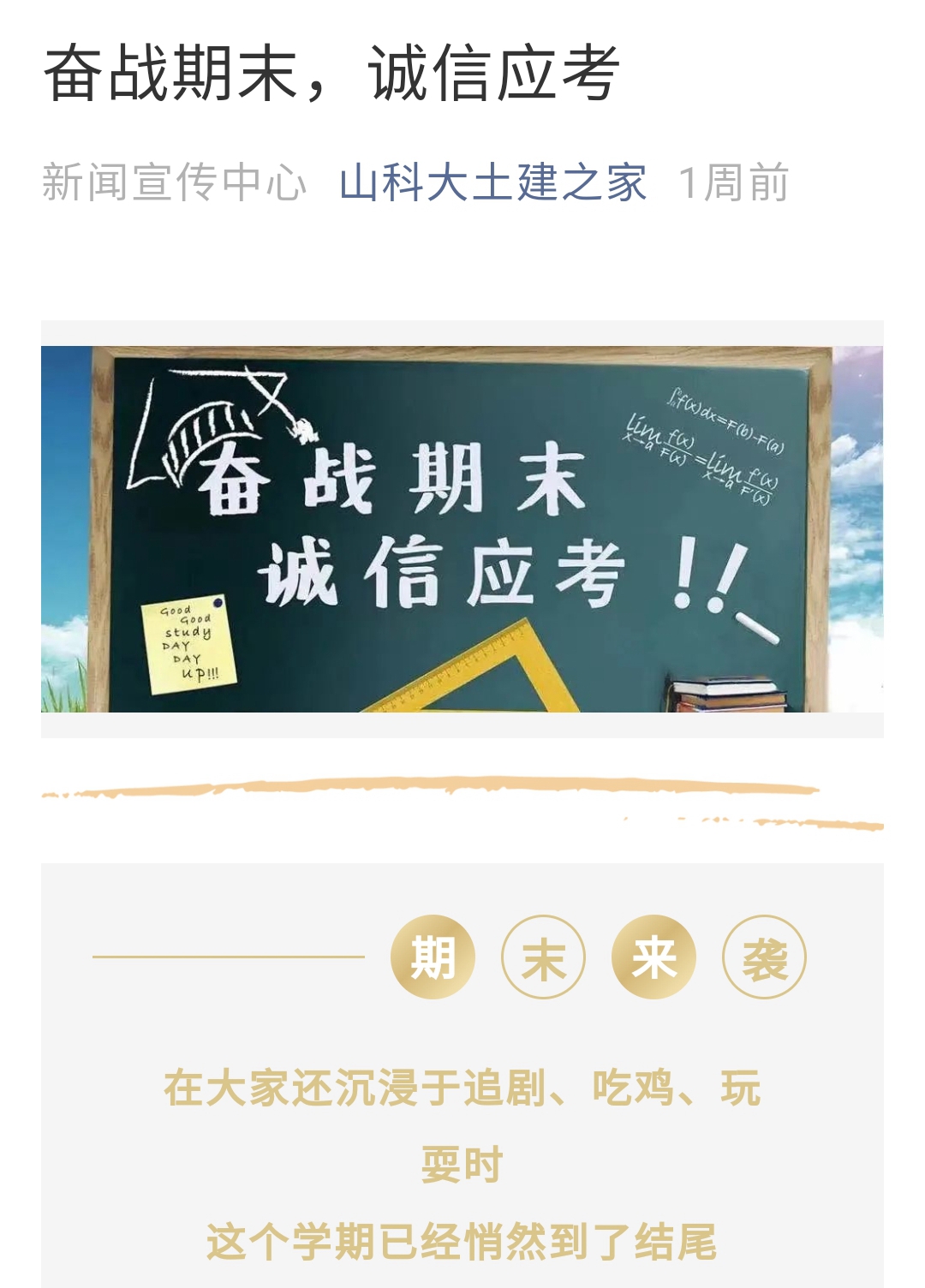学院对近4年学生考试违纪处分情况进行通报,在“山科大土建之家”微信公众号、“土建易班”平台累计发布宣传教育推文近10篇,于宿舍楼下张贴“诚信应考”海报,营造良好氛围。