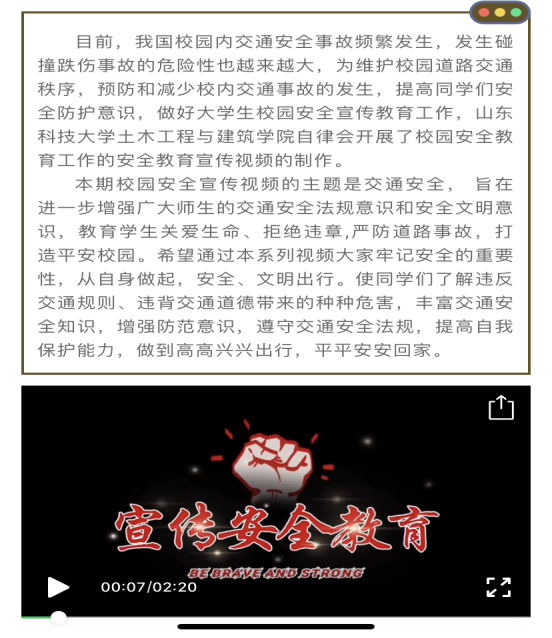 自2021年3月至6月,正规滚球app平台官网自律会先后推出了以校园防火、预防电信诈骗、预防疟疾、交通安全、食品安全、意外事故处理和防溺水为主题的十三期校园安全教育视频。视频的主题涵盖内容广泛,深入学生生活,结合学生创意编排演绎,以喜闻乐见的形式、通俗易懂的方式向学生普及了安全知识、增强了安全意识。正规滚球app平台官网自律会以视频为媒介,协同正规滚球app平台官网新闻宣传中心,在“山科大土建之家”微信公众号与“山科大正规滚球app平台官网自律会”QQ公众号上向学生宣讲校园安全隐患及处理措施的知识,传播范围广、力度大,完善了校园安全体系,降低了校园安全事故发生的可能性。