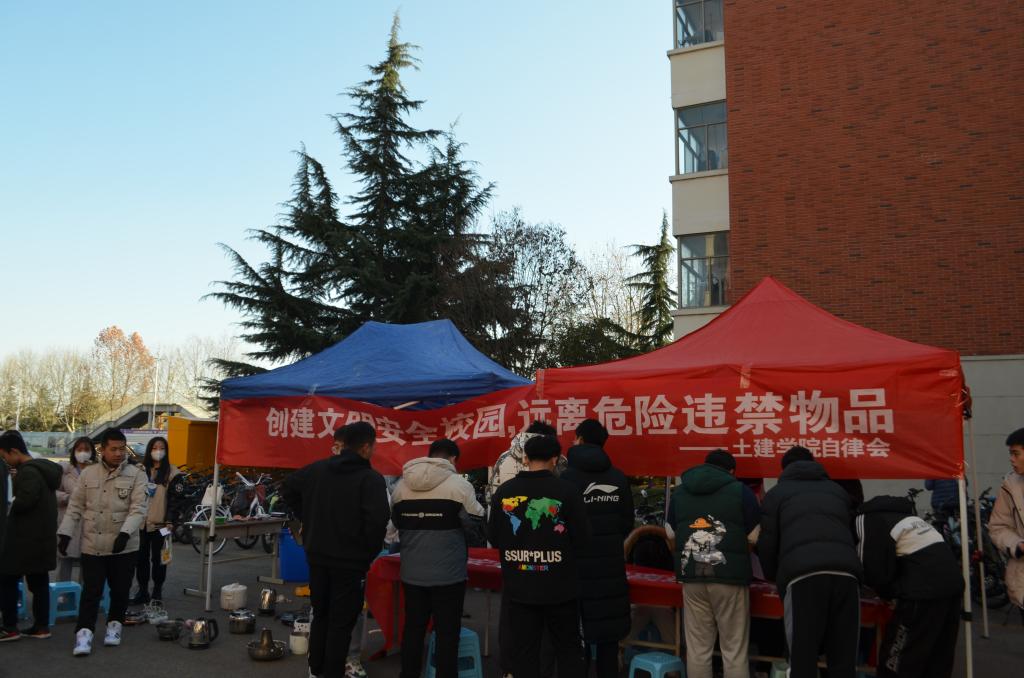 为增强同学们的安全意识,提高同学们对安全防范的认知水平,营造和谐安全的校园环境,11月23日下午,正规滚球app平台官网自律会在B2-B4宿舍楼前开展“创建文明安全校园,远离违禁危险物品”安全教育主题活动。学生工作办公室主任朱统汉、辅导员刘超到场进行了细致的指导,传达了学校安全工作精神。