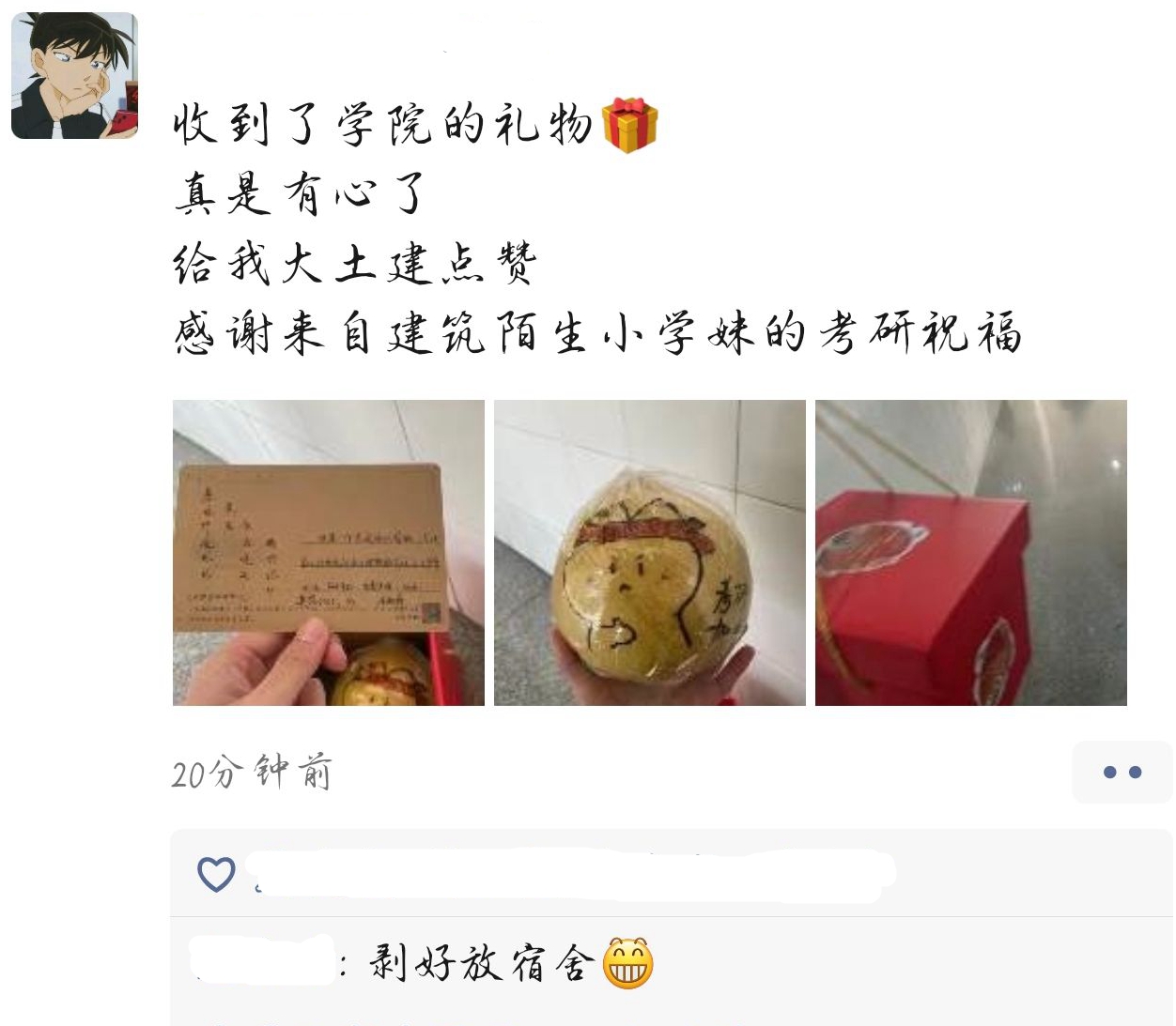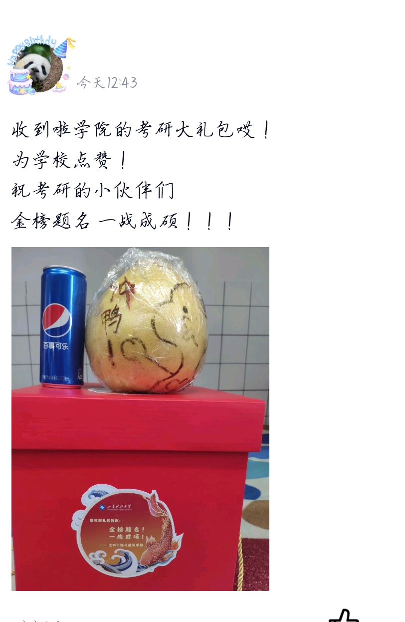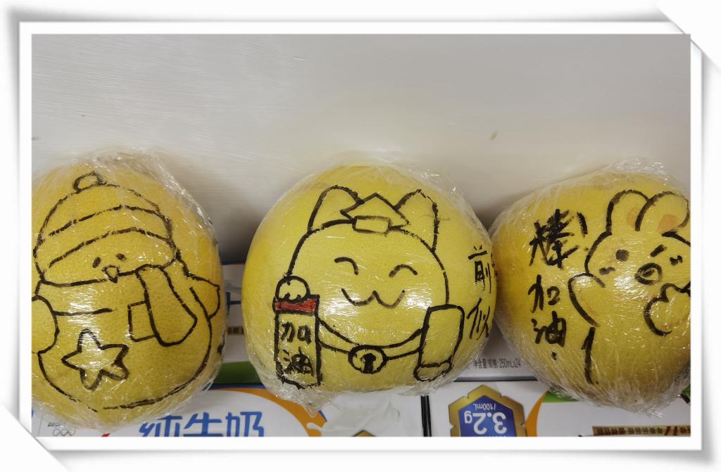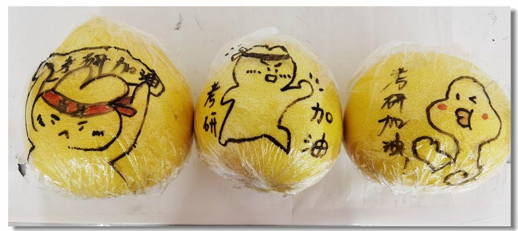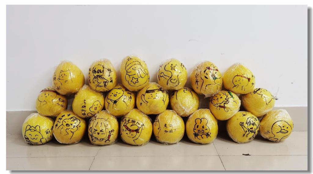 此外,学院专门设计了“加大版”惊喜盲盒,内含:创意手绘的“加油柚”,寓意“加油呦”;可揉捏解压的柿子外形的减压神器,寓意“事事如意”;有快乐神仙水之称的百事可乐,寓意“百事顺利”。据负责本次活动的辅导员张翌说:“现在正是柚子成熟的季节,在柚子上面画创意的涂鸦并写暖心的祝福,希望柚子的清香和有趣的图文能够缓解考研学子的压力”。土木工程2019-1班高宁表示,“很开心能够帮忙准备考研盲盒,希望学长学姐可以感受到我们满心的祝福,能够在紧张的考研冲刺阶段会心一笑,以最好的状态应对考研!”。工程管理2018-2班李俊秋说:“前两天我在自习室学习的时候,有学妹突然给我发消息说老师给我们每个人准备了礼物,还给我发来剧透照片。我一看是柚子和明信片,上面有可爱的图画和祝福,顿时感受到了老师们的细心和暖心,也对今天分发礼物充满了期待。”