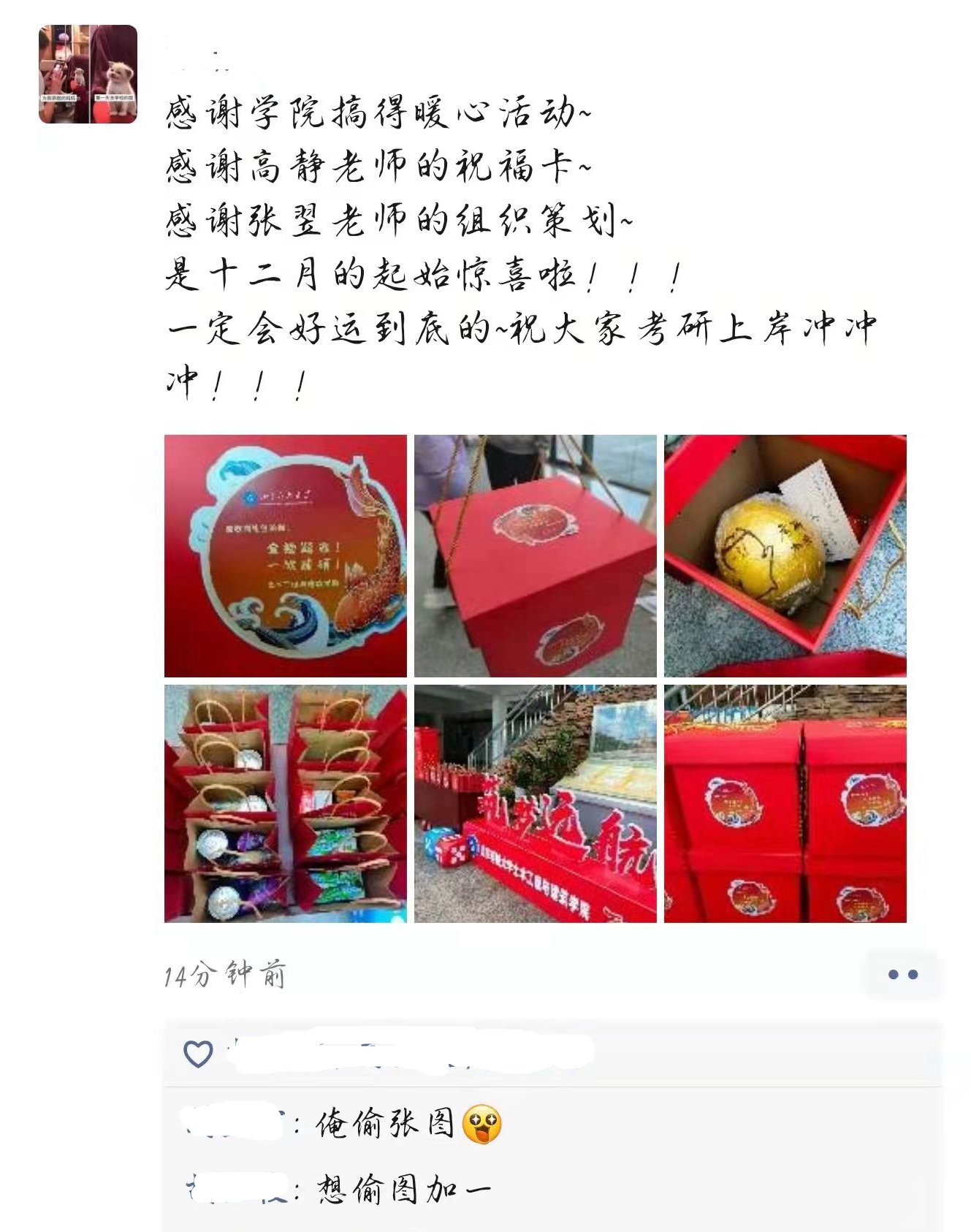 对于有课无法到场的学生,辅导员老师们专门反复嘱咐班长团支书,一定要将没领到的学生们统计名单,补发礼物,让每一位考研学子都能享受到学院的关爱。