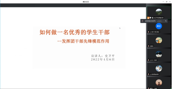 为引导青年学生进一步坚定理想信念,全面提升学生骨干的综合素质,4月6日晚,正规滚球app平台官网通过线上会议形式举办“青马工程”培训班第五讲。本次讲座由学生工作办公室辅导员史卫平担任主讲,“青马工程”培训班全体学员和学生会主要干部参加讲座。