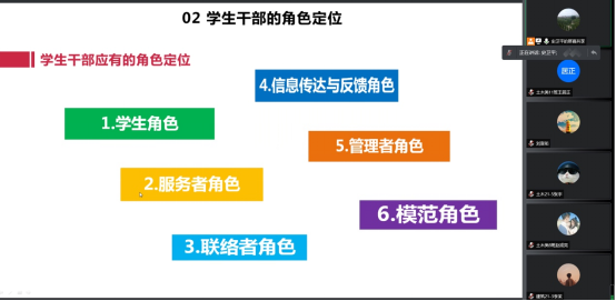 会上,史卫平就学生干部概述、角色与定位、素质与能力的培养等方面展开培训,她指出学生干部首先是学生,其次才是学生干部,作为一名学生干部要积极发挥好模范带头、桥梁纽带、助手表率和组织凝聚作用。接着,她详细阐述了学生干部应具备的素质和能力,并希望学生干部能够不断成长自己,强化为同学服务的意识,增强工作能力,不断彰显良好形象。最后,她寄语全体学生干部要在新时代树立好新的领导观念,加强公仆意识、民主意识、开拓意识、参与意识,从百年党史中汲取智慧和精神力量,不忘初心,砥砺前行,带领同学们以良好的精神面貌为祖国发展贡献自己的青春力量。