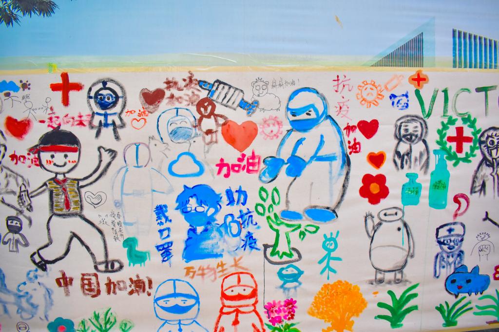 颜料、画笔、素描、涂鸦……在活动现场,参与彩绘活动的同学利用各种工具和画法,将原本洁白的画布绘制成饱含青春范,彰显自然风的图画,用五彩斑斓的画笔传播着青春抗疫正能量。彩绘作品以“抗击疫情”为主题,参与活动的同学将疫情中的所见、所闻、所思、所感描绘出来:有奋战在一线的白衣天使、有抗击疫情的感人场景、有埋藏在内心深处的话语……无论是简单朴实的勾勒还是精致繁复的设计,都体现出大学生对待疫情积极向上的乐观态度,饱含着对疫情早日结束的美好期盼。