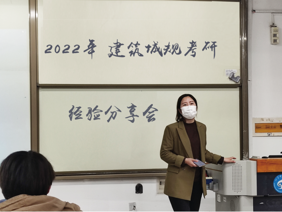 范蕊分享了自己成功调剂考入合肥工业大学的心得体会,并提醒同学们要根据自己的分数在调剂时多投几个满意的学校,并且时刻关注调剂信息,多向相关老师和同学请教。最后,已经签约至青岛腾远设计事务所的吴怡,分享了自己假期实习的情况及最终确定就业的历程,并且鼓励同学们假期实习中积累工作经验。
