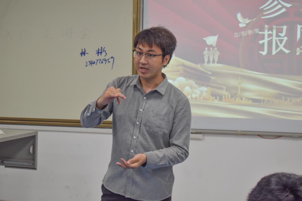 会议伊始,段晓斌根据本人实际经历,为同学分享了入伍要求、入伍流程,政策优待、军校考试等内容,同时展示了入伍后的军旅生活状况。他希望广大有理想、有抱负、有知识的青年学子积极响应党和国家的征兵号召,把个人理想抱负融入强军梦、中国梦,踊跃报名应征,到部队中成长和锻炼自己,为国防事业贡献力量。随后林彬结合自身考研情况以及参加社会实践情况进行了经历分享,他希望与会同学能够向高处看去、向名校看齐,增加知识储备,向在座同学介绍了辅修专业优缺点和考研教材选择,同时也告诫同学们在社团工作中要锻炼个人能力,不要注重虚名浮利。会议在两位分享人声情并茂、妙趣横⽣的讲解中圆满结束,与会学生纷纷表示受益匪浅。