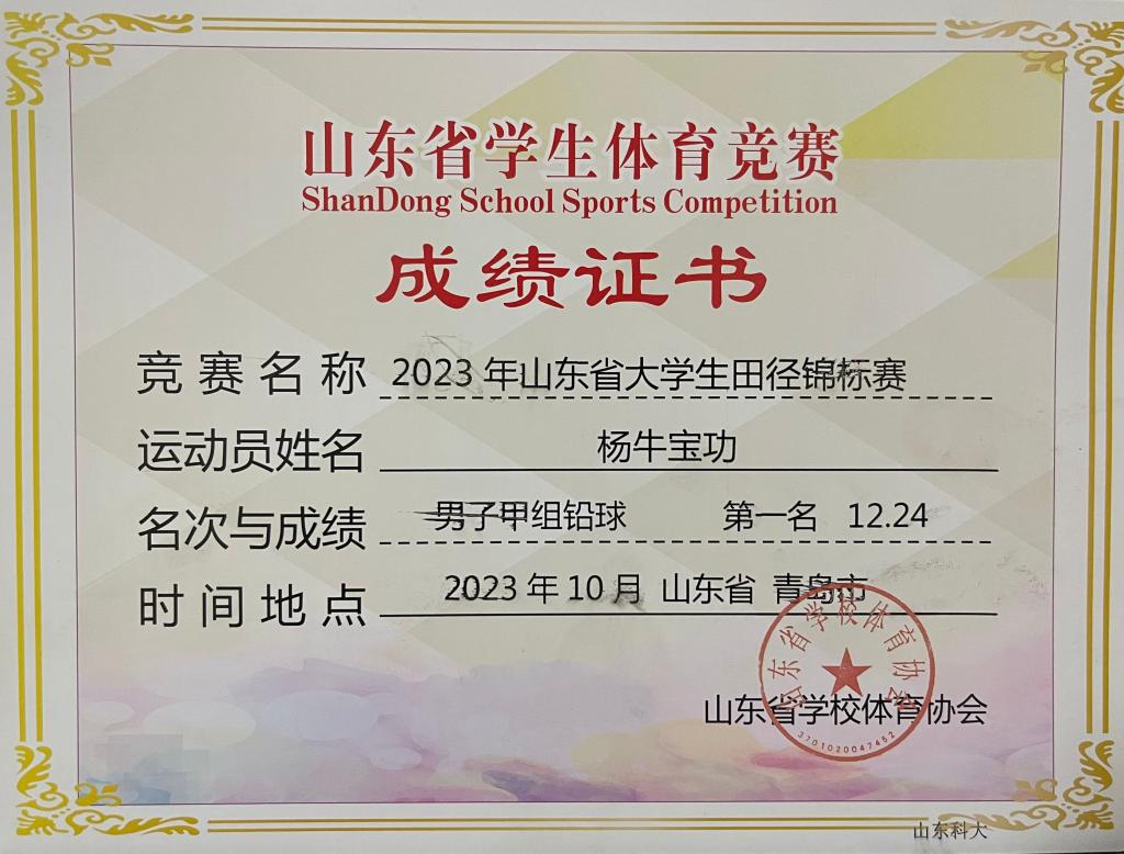 近日,由山东省学校体育协会主办的“2023年山东省大学生田径锦标赛”在青岛市民健身中心体育场落下帷幕,正规滚球app平台官网土木工程专业2021级8班本科生杨牛宝功获男子甲组铅球项目金牌和甲组男子铁饼项目第六名。