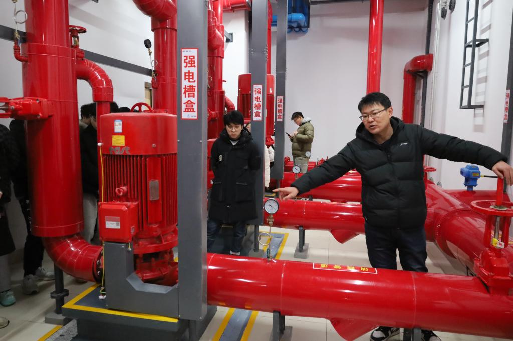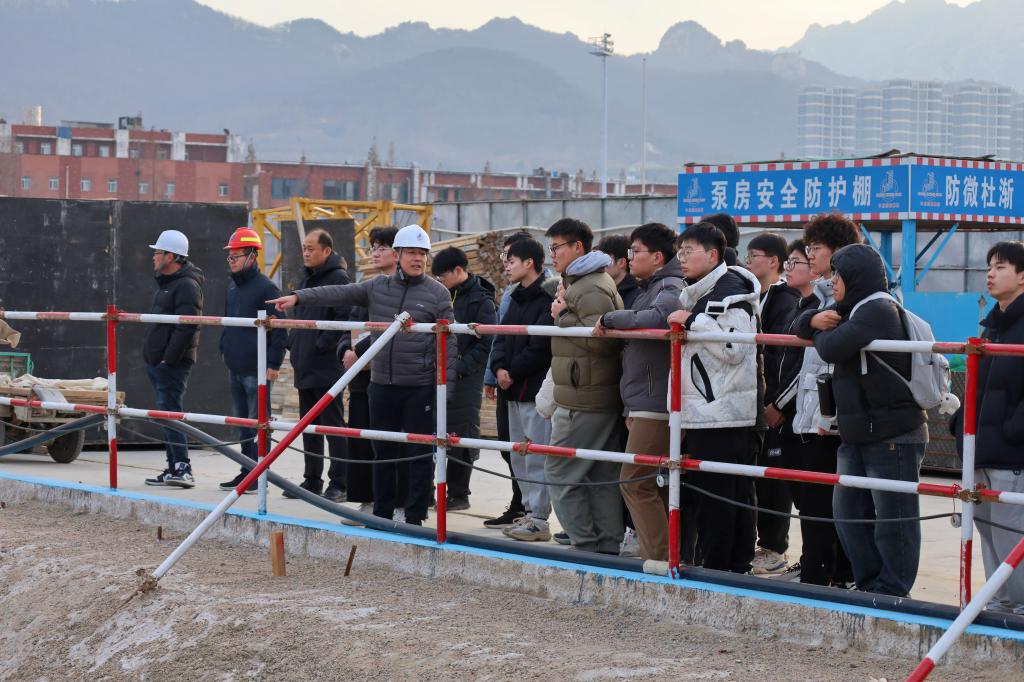 孙清典首先带领同学们来到学校供水供热泵房,详细介绍了学校站点分布、耗电、供暖及供水情况,并深入讲解了供水回水设备、水罐仪器设备及其供水原理,让同学们对校园基础能源供应设施有了直观的认识。随后,在韩庆防的带领下,同学们来到图书馆地下室,同学们参观了消防泵房、变配电室等设施,还了解到地下停车场雨棚、保温管道的材料使用细节,进一步拓宽了同学们的专业视野。最后,全体人员聚集在校东门建设施工现场,刘志强为同学们讲解了工地工程勘测、开挖、打桩、验收等施工顺序,强调了依据国家规范施工的重要性,使同学们对建筑施工流程有了清晰的认知。