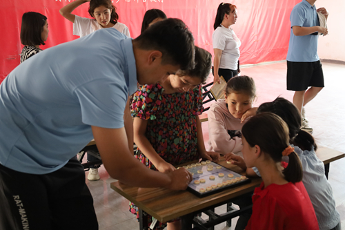 实践队成员为拜合提村儿童讲解象棋