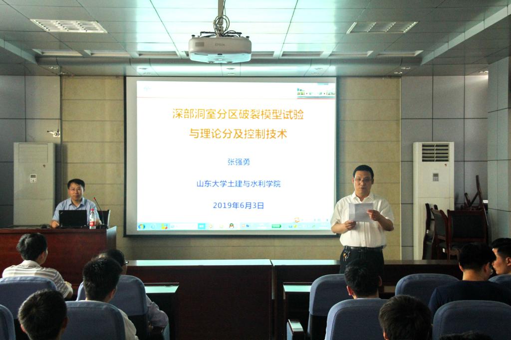 6月3日,正规滚球app平台官网邀请到泰山学者特聘专家、教育部新世纪优秀人才支持计划获得者、山东大学土建与水利学院副院长张强勇于土建楼219报告厅作报告,学院副院长张宪堂主持了本期名家讲坛。报告以“深部洞室分区破裂模型试验与理论分析及控制技术”为题,从深部洞室分区破裂模型及工程应用等方面展开讲解。