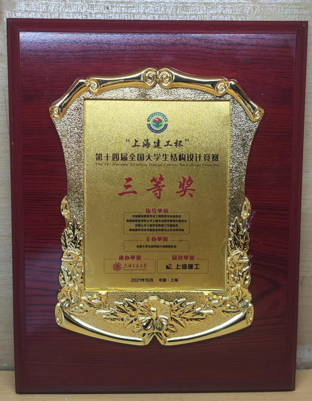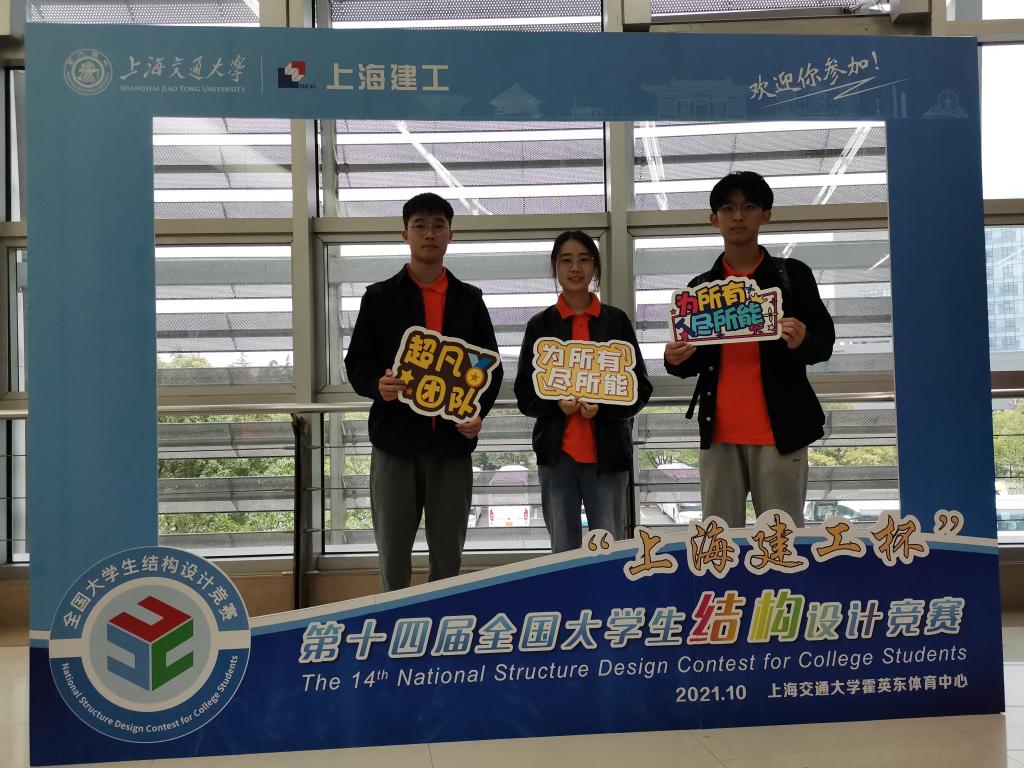 10月17日下午6时,历时5天的2021年“上海建工杯”第十四届全国大学生结构设计竞赛在上海交通大学霍英东体育中心圆满落幕,并同步设立了分会场连线。全国31个省(市、自治区)竞赛秘书处组织分区赛共计550所高校、1148支队伍(本科994,专科148)参赛,111所高校112支队伍杀出重围,进入全国赛。我校代表队(队员:荣浩宇、周嘉、赵鑫源,指导教师:都浩、郇筱林,领队:刘泽群)荣获三等奖。